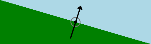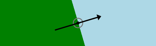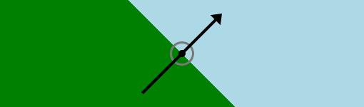 Так вы получите результат, показанный на рисунке 1, к которому я добавил (в Photoshop) стрелку, которая показывает направление линии градиента и центральную точку фоновой области. Каждая «полоска», составляющая градиент, перпендикулярна линии градиента — поэтому граница между двумя цветами в точке 50% перпендикулярна по отношению к линии градиента. Этот закон перпендикулярности работает всегда.