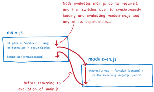 Подход CommonJS имеет несколько последствий, и я расскажу об этом позже. Но одно это означает, что в Node.js с модулями CommonJS вы можете использовать переменные в вашем спецификаторе модуля. Вы выполняете весь код в этом модуле (до инструкции require), прежде чем искать следующий модуль. Это означает, что переменная будет иметь значение при переходе к определению модулей.