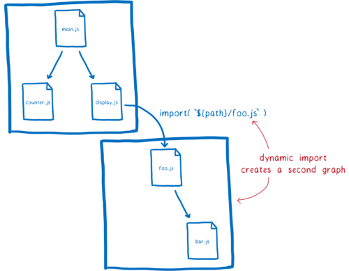 Это работает так: любой файл, загруженный с помощью import(), обрабатывается как точка входа в отдельный граф. Динамически импортируемый модуль запускает новый граф, который обрабатывается отдельно.