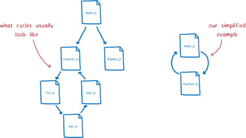 Давайте посмотрим, как это будет работать с модулями CommonJS. Во-первых, основной модуль выполнит оператор require. Затем будет загружен модуль counter.