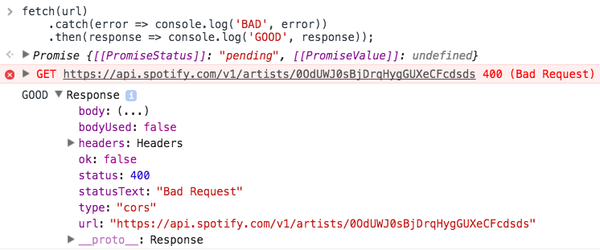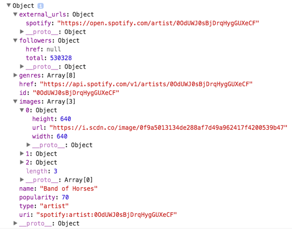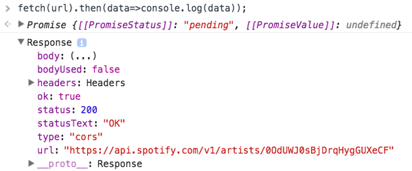 Вот простой пример c использованием API Spotify. Установим URL в качестве переменной и передадим её в fetch(). Затем установим колбэк, выводящий в консоль данные в качестве аргумента then().