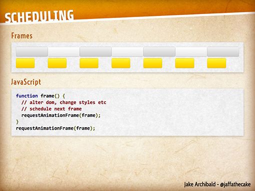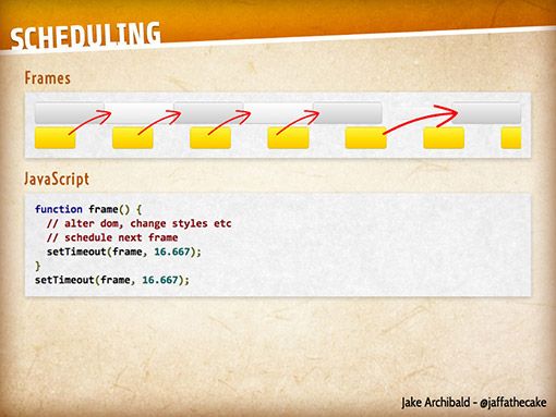 Джейк Арчибальд подготовил отличные слайды, которые показывают проблему — setInterval не сделает анимацию плавной, и достаточно скоро начнет пропускать кадры: