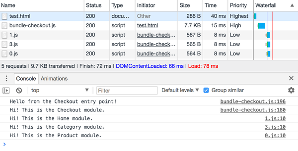 Если вы загрузите файл bundle-checkout.js на тестовой странице и посмотрите на отладчик Chrome, вы можете убедится, что загружаются только три чанка, как и ожидалось. Вы также можете увидеть, что сообщение из модуля Checkout поступает из bundle-checkout.js, что означает, что модуль Checkout попал в этот файл.