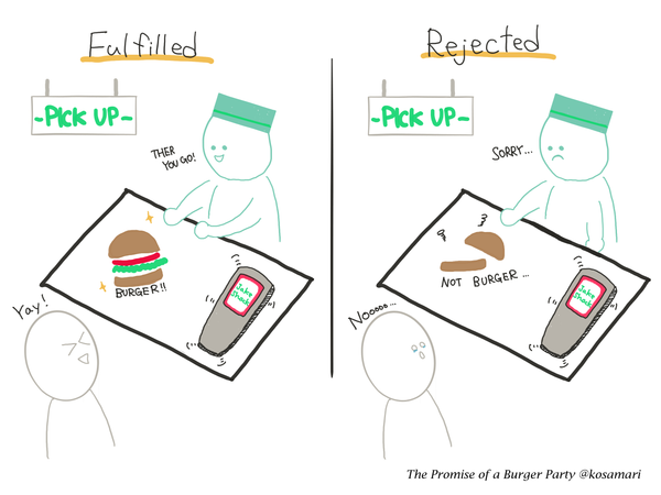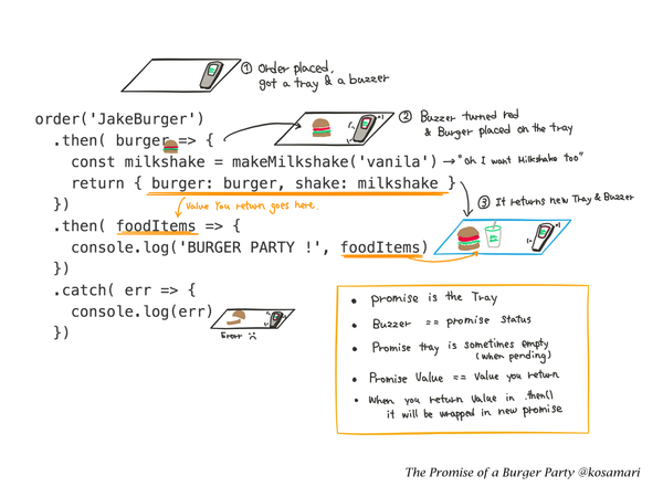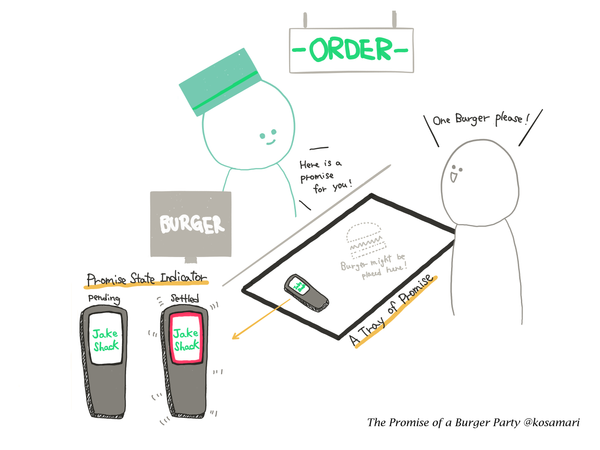 Поднос — это промис, обещание ДжейкШака преподнести вам вкуснейший бургер, как только тот будет готов, а брелок — индикатор состояния вашего заказа. Брелок молчит? — значит заказ в процессе и лучшие повара трудятся над вашим бургером. Брелок загорелся красным и гудит? — значит заказ приготовлен.
