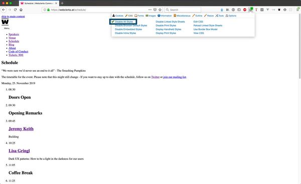 Ещё одной полезной функцией расширения Web Developer является его способность отключения стилей на странице. Отключение CSS поможет проверить различные вещи: