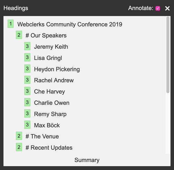 Для проверки структуры документа можно использовать W3C Markup Validation Service или инструмент tota11y (см. скриншот выше).