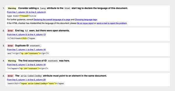 Вы можете использовать W3C Markup Validation Service для проверки разметки. Валидатор не отлавливает все ошибки, но это в любом случае хороший способ обнаружения очевидных багов в вашем HTML, например, дублирующихся id или сломанных ARIA-атрибутов.