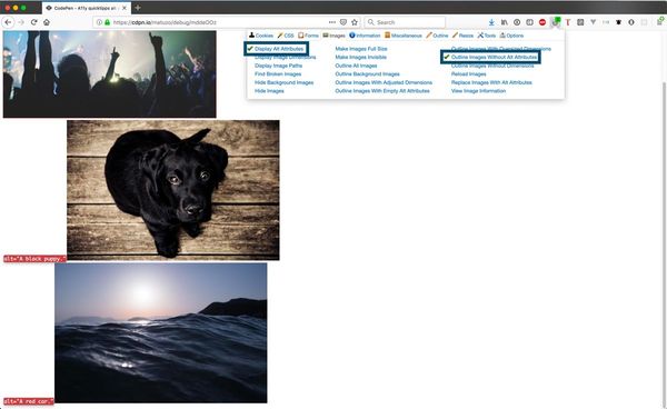 Первый полуавтоматический тест, который я выполняю — проверяю, есть ли у изображения описание и правильное ли оно. Для этого я использую браузерное расширение Web Developer. С его помощью можно выделить картинки, у которых нет атрибута alt, а также вывести значение alt рядом с изображением.