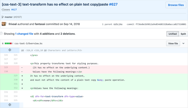 В результате обсуждений в рабочей группе, в 2018 году было принято решение: дополнить стандарт CSS указанием, что свойство text-transform не должно влиять на копируемый текст.