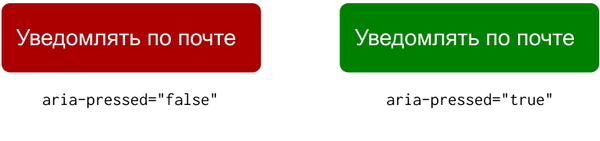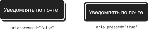 Интересное происходит, когда на кнопку с атрибутом aria-pressed наталкиваются какие-то скринридеры: они определяют её как «переключатель» или, в некоторых случаях, «кнопка нажата». Наличие атрибута состояния изменяет сущность кнопки.