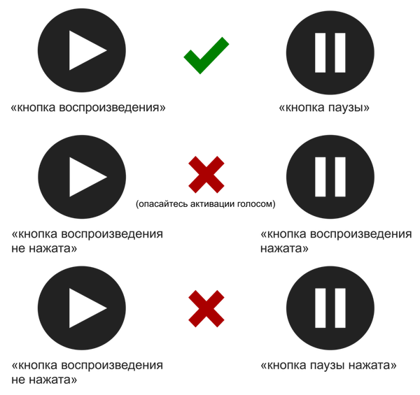 Это везде хорошо работает, кроме случаев, когда идёт речь о распознавании речи и голосовом управлении. В режиме распознавания речи обычно нужно произносить названия кнопок вслух. И, если пользователь увидел кнопку паузы, то его первой мыслью будет произнести «пауза», а не «воспроизведение». Поэтому более надёжный способ — это изменение подписей к элементам, а не переключение их состояния.