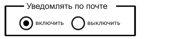 Заголовок группы элементов — это мощный инструмент. Как следует из названия, он является общей подписью для связанных (сгруппированных) элементов. В этом случае элемент <fieldset> работает вместе с <legend> и даёт возможность задать для двух радиокнопок одно описание «Уведомлять по почте». Эти кнопки объединены общим значением атрибута name. Благодаря этому можно переключаться между ними при помощи стрелок на клавиатуре. Использование семантического HTML не только сообщает информацию об элементах, но и влияет на их поведение.
